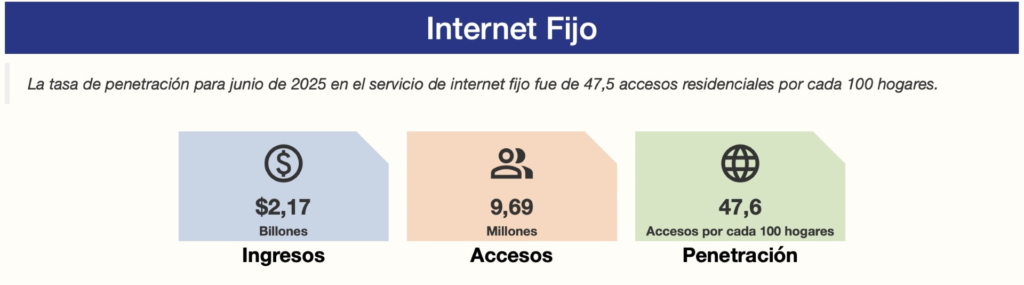 El servicio de internet fijo registró un crecimiento de 8,08 % frente a 2024-2T, alcanzando una penetración de 47,6 accesos residenciales por cada 100 hogares, equivalente a 9,69 millones de accesos.