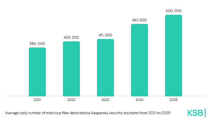 Los sistemas de detección de Kaspersky descubrieron un promedio de 500,000 archivos maliciosos al día en 2025, un 7% más que el año anterior. A nivel global, varias amenazas mostraron un repunte notable: las detecciones de ladrones de contraseñas crecieron 59%, las de software espía (spyware) aumentaron 51% y las de puertas traseras (backdoors) subieron 6% respecto a 2024.