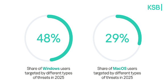 De acuerdo con el análisis, Windows sigue siendo el principal objetivo de los ciberataques; el 48% de los usuarios de este sistema operativo fue blanco de distintos tipos de amenazas a lo largo de 2025. En el caso de los usuarios de Mac, la cifra es del 29%.