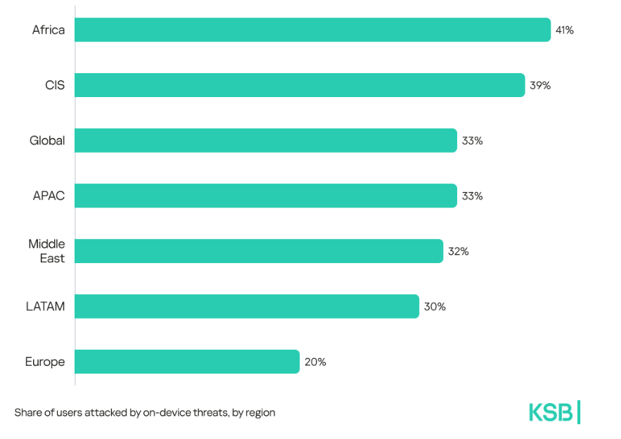El 33% de los usuarios sufrió ataques con amenazas en dispositivos. Estas incluyen malware que se propaga a través de unidades USB extraíbles, CD y DVD, o que inicialmente llega a una computadora en formatos no abiertos (por ejemplo, programas en instaladores complejos, archivos cifrados, etc.).