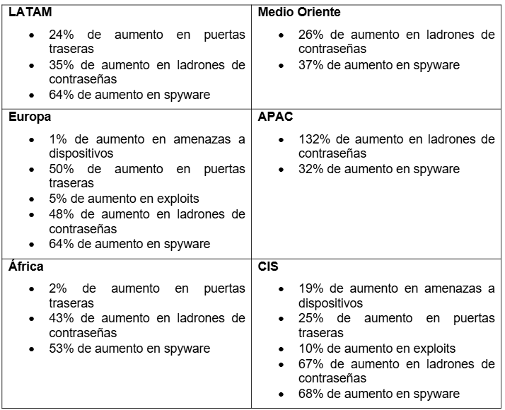 En América Latina, la tendencia también fue al alza: los backdoors aumentaron 24%, los ladrones de contraseñas 35% y el spyware 64%.