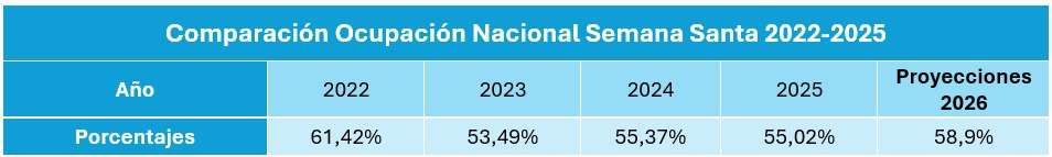 Las cifras indican una tendencia de recuperación gradual en el sector. Mientras que en 2025 la ocupación durante Semana Santa fue de 55 %, para este año se proyecta que el indicador llegue a 58,9 %.